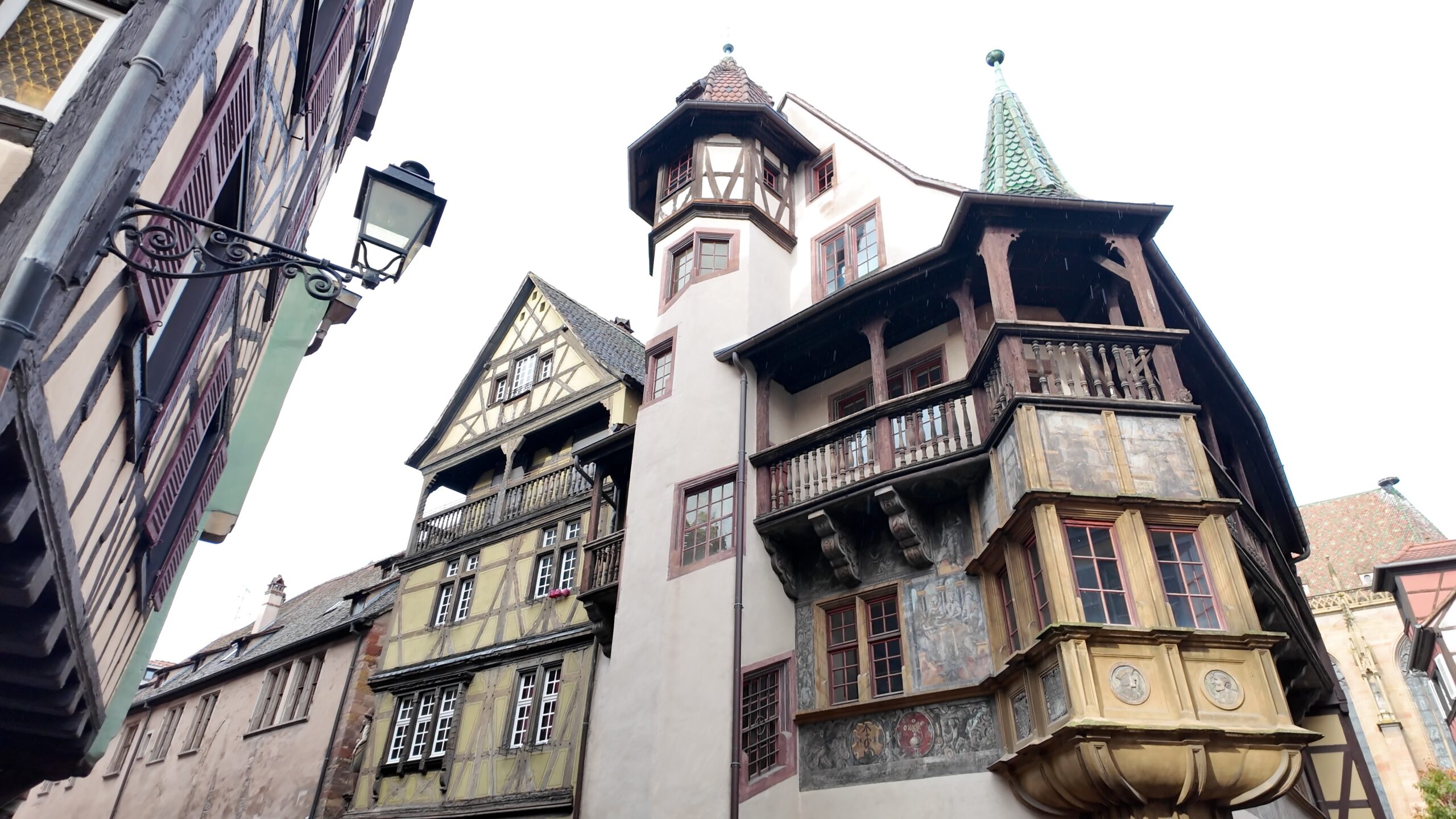 続いてやって来たのが1537年に建てられた「プフィスタの家」です。ここも写真を撮っている観光客がひっきりなしに来ていました。どこかで見覚えがある……と思った方も多いはず。実はここ、ジブリ映画『ハウルの動く城』のモデルになったと言われている場所です。八角形の塔や木造のバルコニー、そして壁一面に描かれた緻密なフレスコ画。今にもハウルとソフィーが空から降りてきそうな、魔法のような空気が漂っています。歴史的建造物としての価値はもちろんですが、アニメの世界に入り込んだような没入感を味わえる、コルマール最高のフォトスポットです。