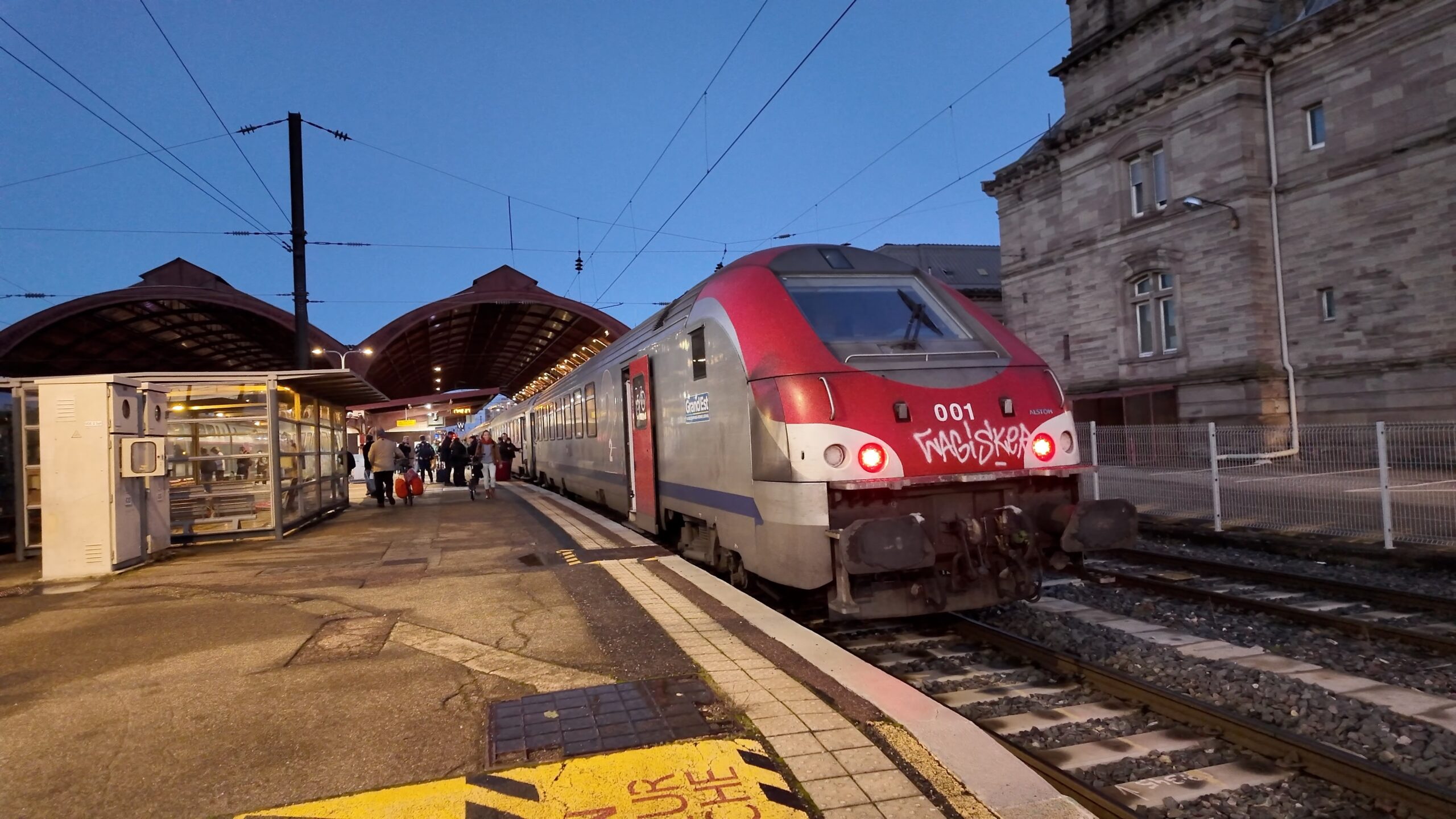 駅舎に入ってストラスブールへ行く列車の時刻を確認すると、丁度ホームに列車が入線していました。これを逃すと30分後なので待たずに乗車する事が出来てよかったです。進行方向とは逆向きではありましたが、座席にも座れました。