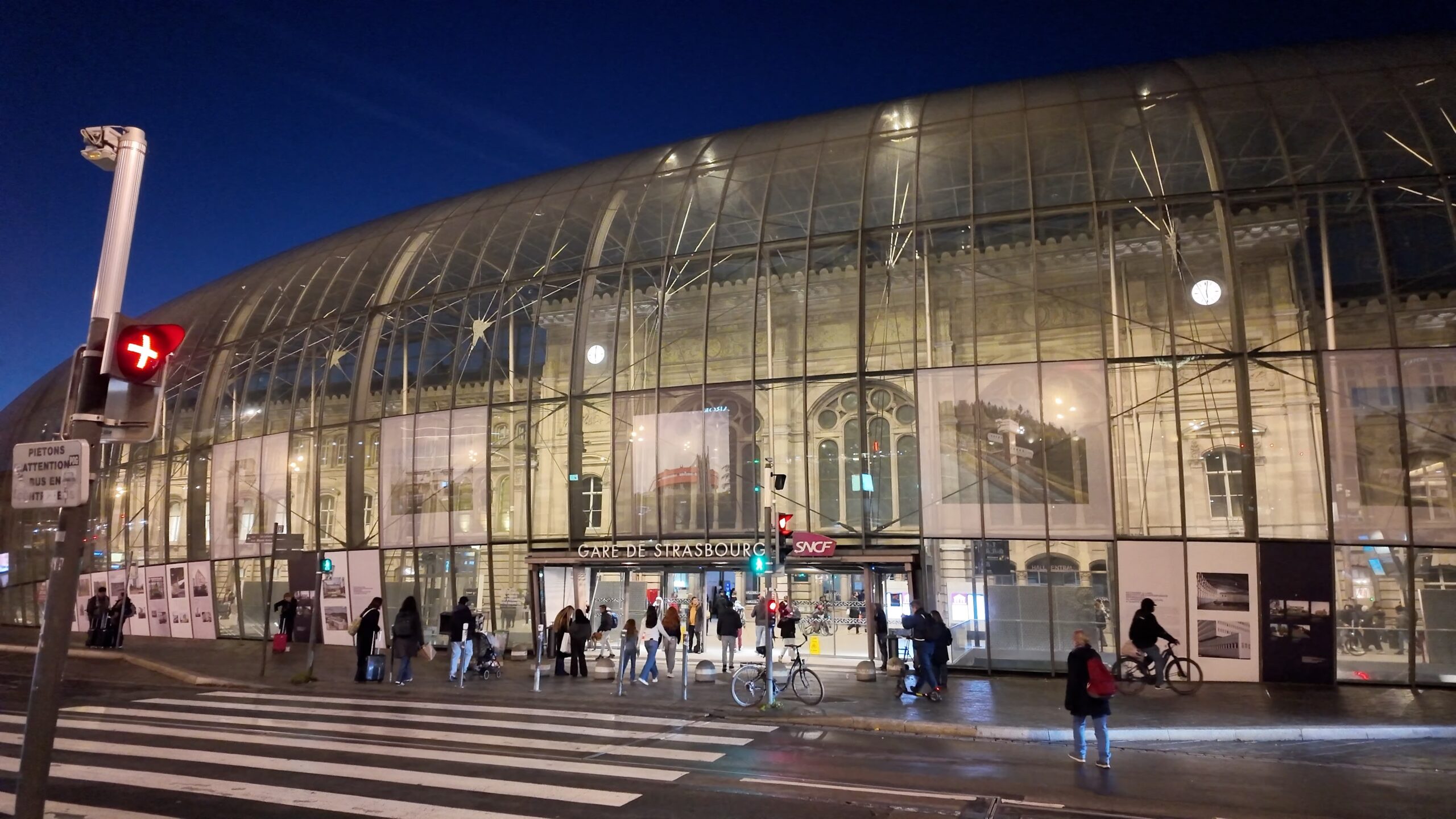 夕方から夜にかけてのストラスブール駅です。観光スポットのようにライトアップされているような感じになり、とても美しい駅舎だと思いました。コルマールと同様にここでも雨があがっていて一安心です。