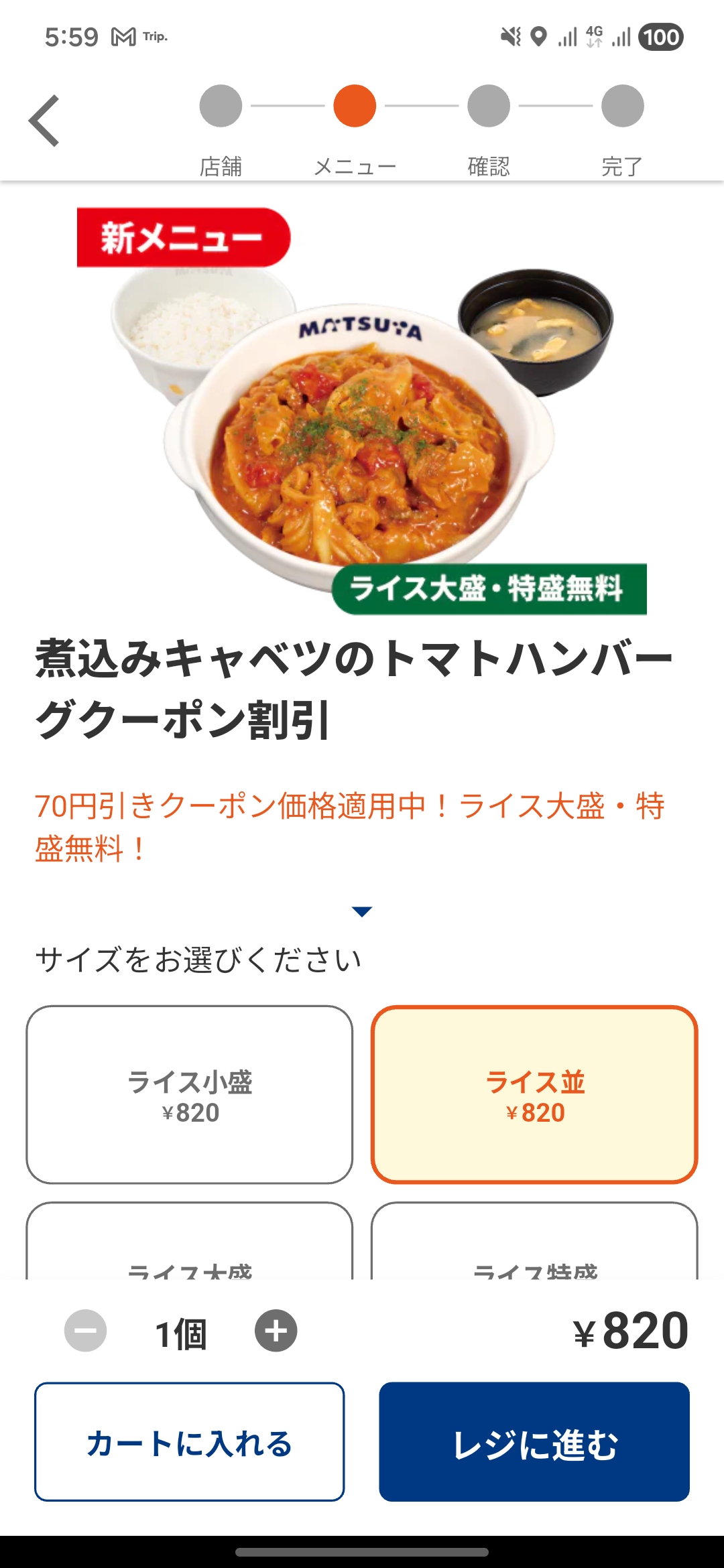 松屋公式アプリクーポン: 70円引き(890円 → 820円)