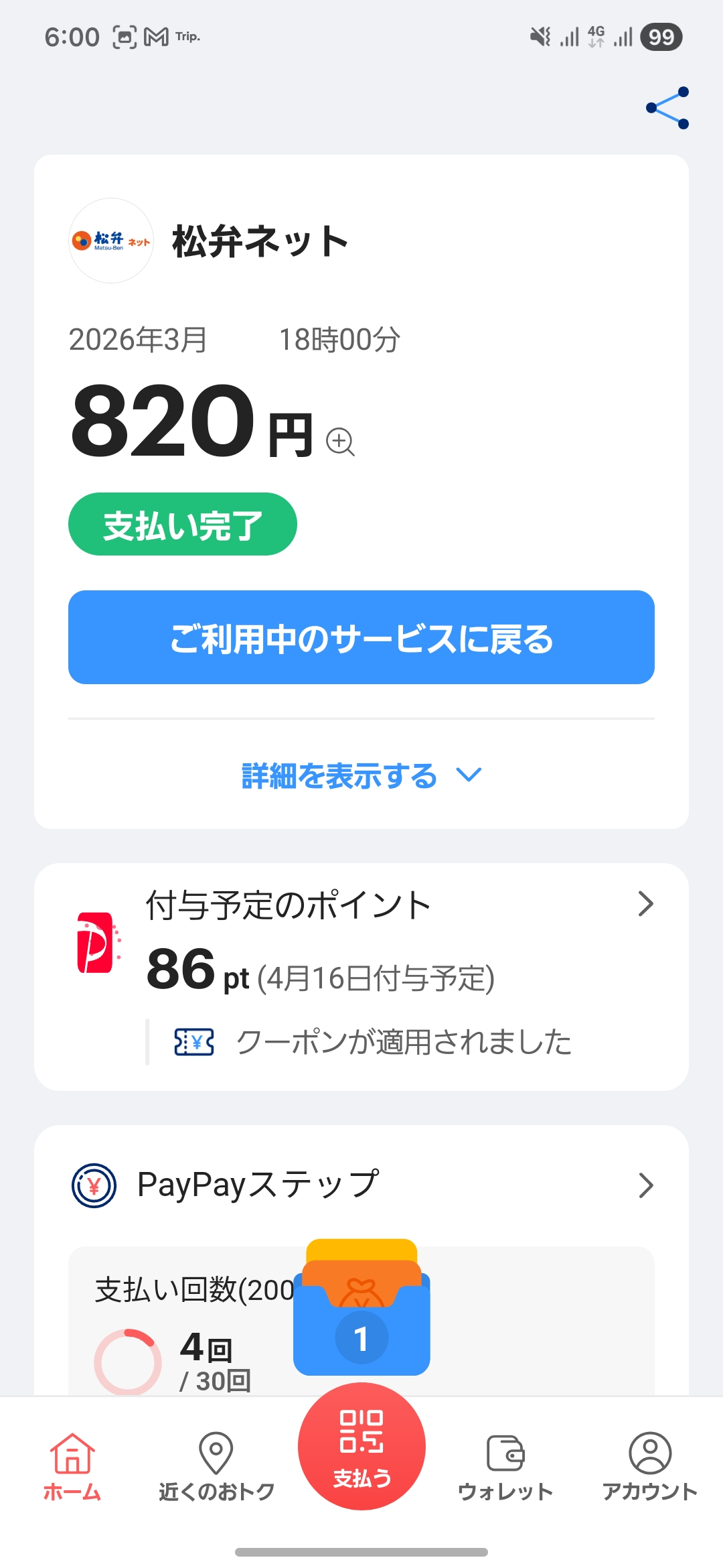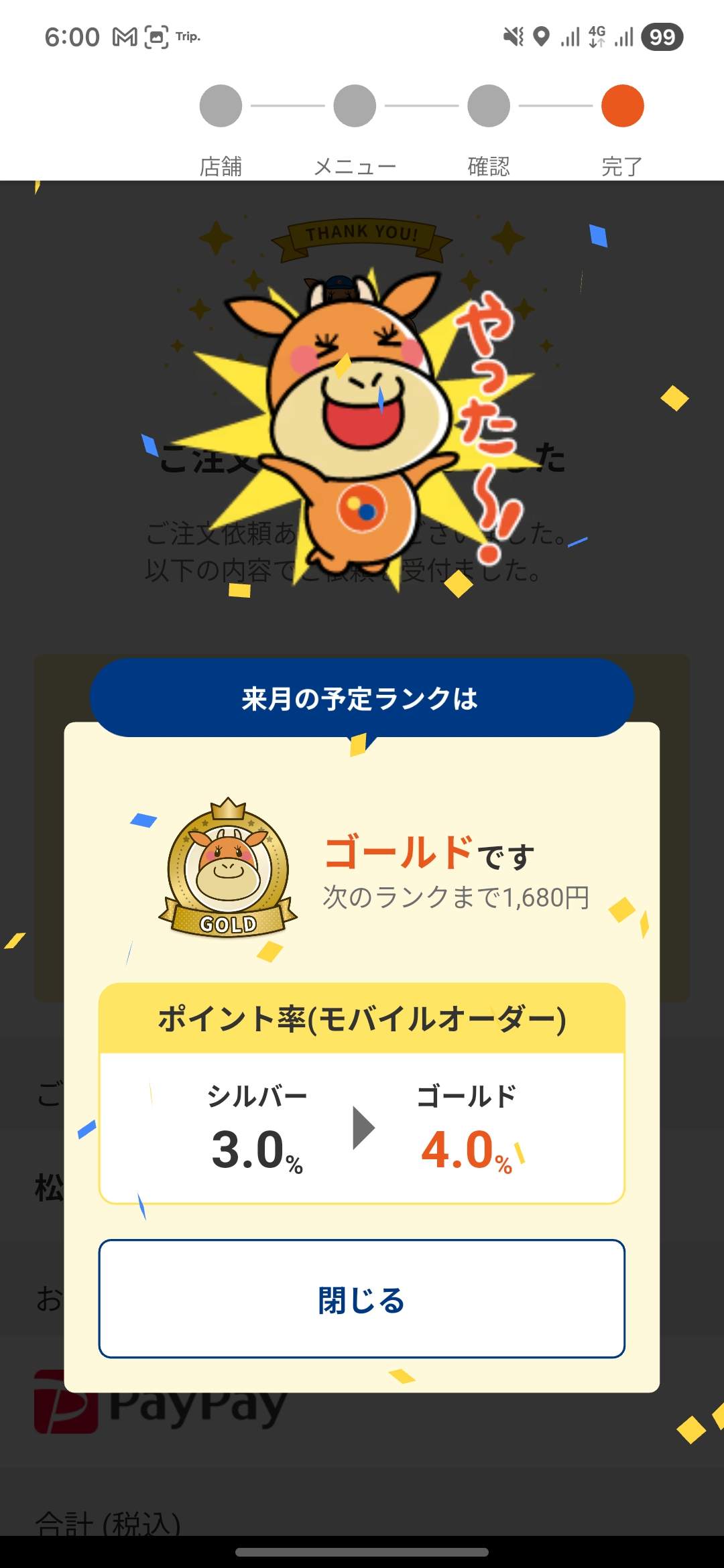 さらに、今回の決済で来月のランクが「ゴールド」にアップ! 還元率が4.0%になるので、次回の食事がさらに楽しみになりました。松屋によく行くなら、2026年3月中は公式アプリからのモバイルオーダー&PayPay払いの組み合わせはもはや必須ですね。